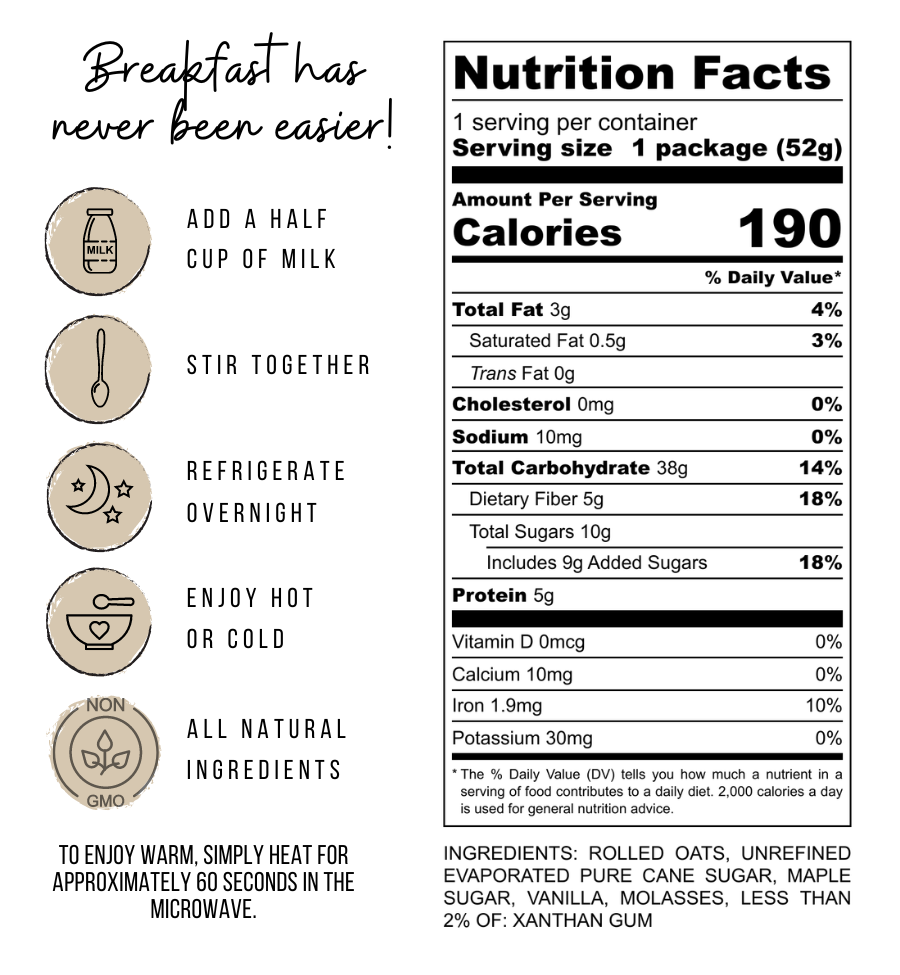Maple Vanilla Overnight Oats are a quick and easy way to enjoy a nutritious breakfast, pour the contents into a mason jar or bowl, stir in 1/2 cup of your favorite type of milk, put the lid on and refrigerate overnight. Your oats are ready to eat the next morning! If you prefer warm oatmeal, then simply microwave your oats for 60 seconds.